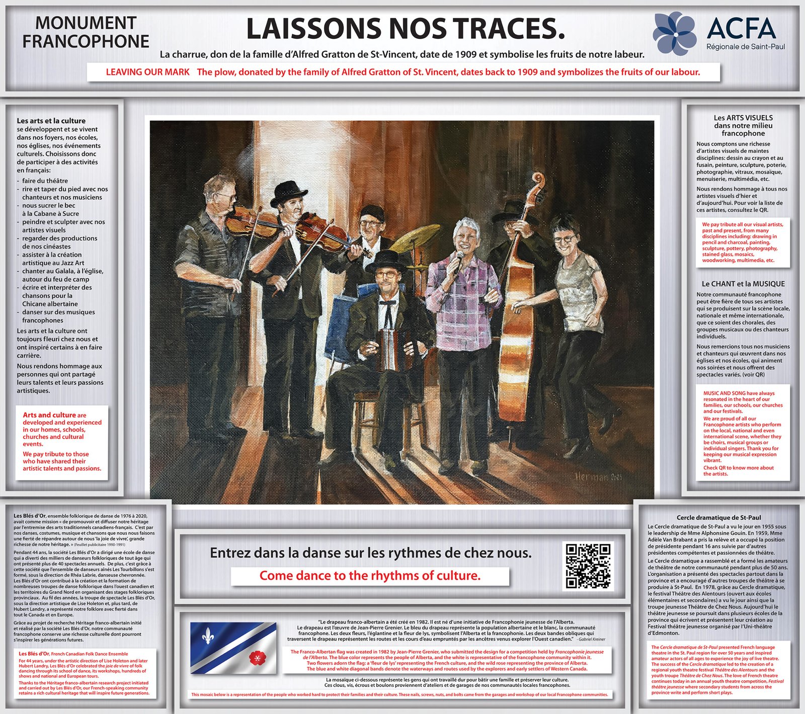 La mosaïque représente les gens qui ont travaillé dur pour bâtir une famille et préserver leur culture. Ces clous, vis, écrous et boulons proviennent d’ateliers et de garages de nos communautés locales francophones.