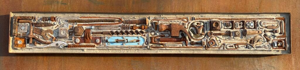 The mosaic is a representation of the people who worked hard to protect their families and their culture. These nails, screws, nuts, and bolts came from the garages and workshop of our local Francophone communities.