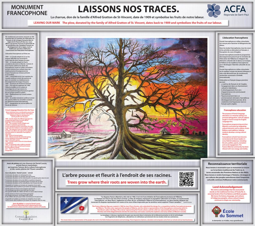 La mosaïque représente les gens qui œuvrent dans le domaine de la technologie. Ces fragments de téléphones, calculatrices et ordinateurs proviennent de nos écoles et de nos commerces.