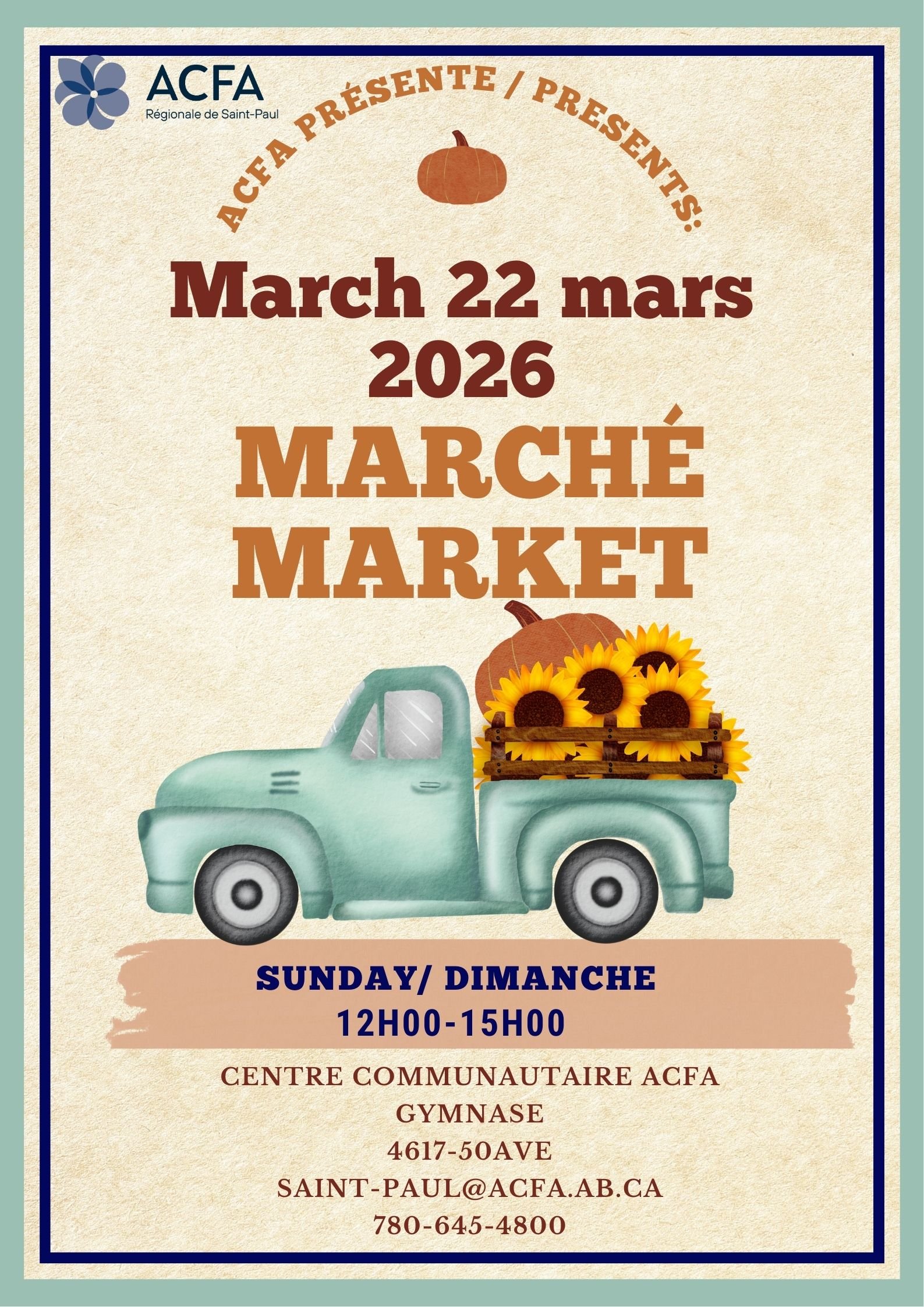 Marché 22 mars, 2026 4617-50 ave Saint-Paul Centre Communautaire Gymnase ACFA Régionale de Saint-Paul 12h00 à 15h00